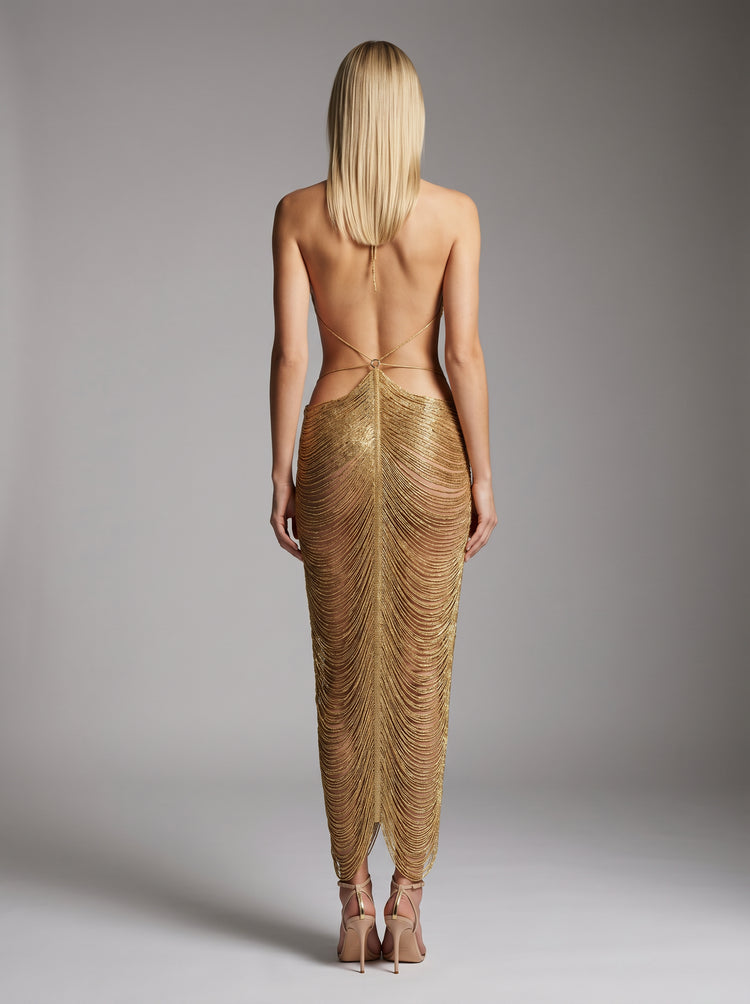 Gold Liquid Chain Fringe Halter Maxi Dress